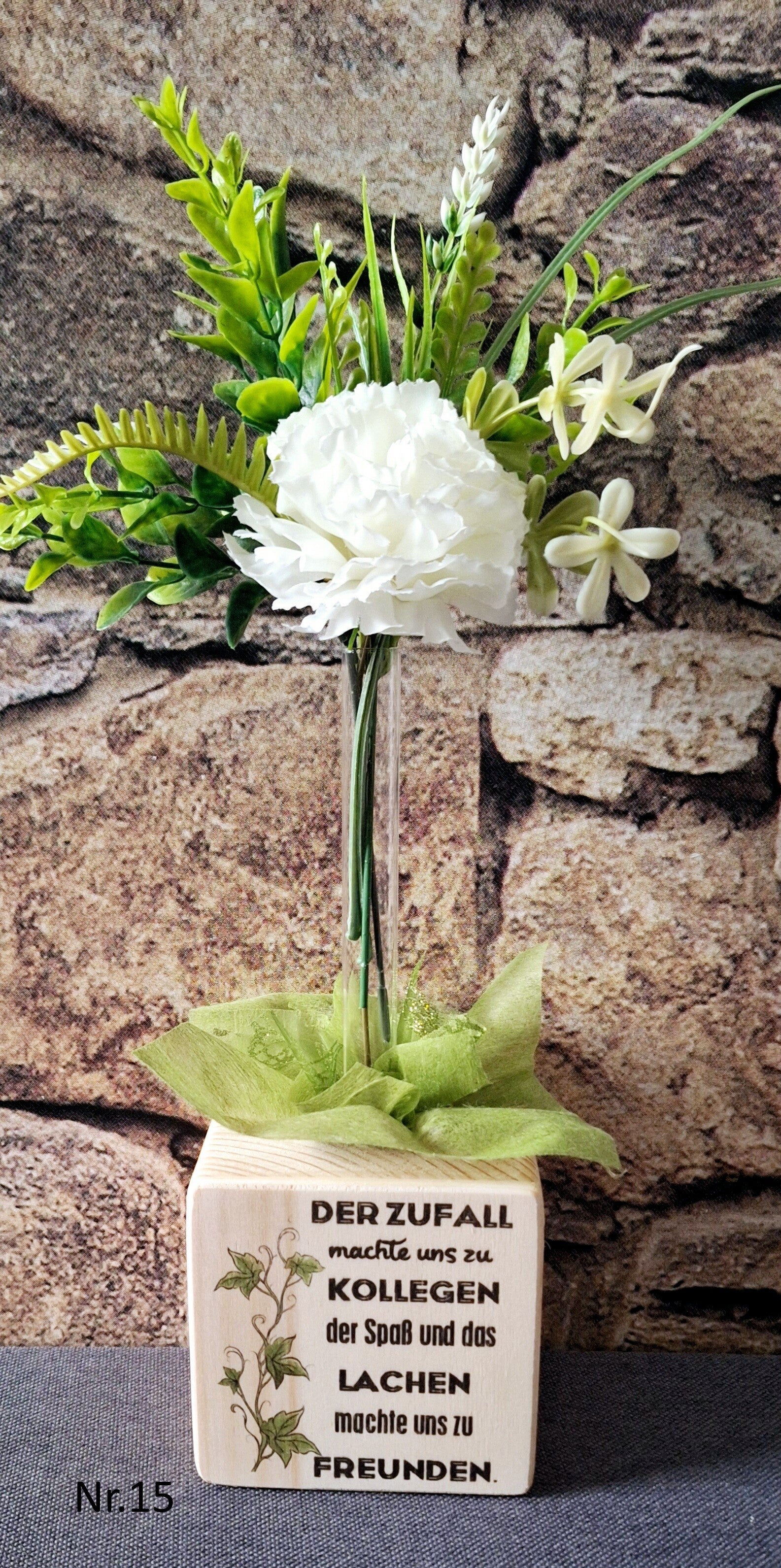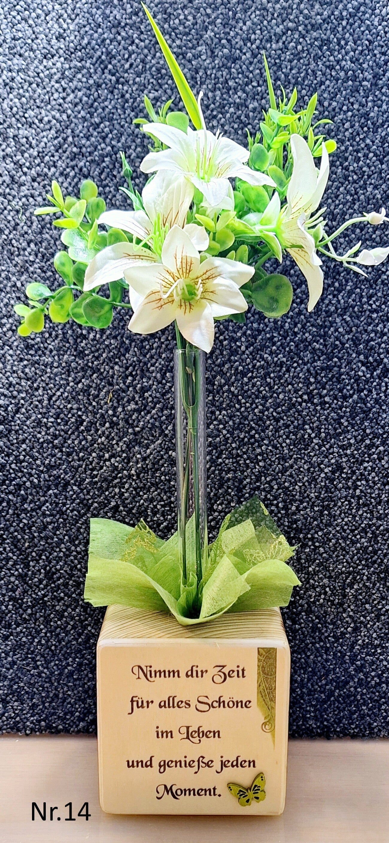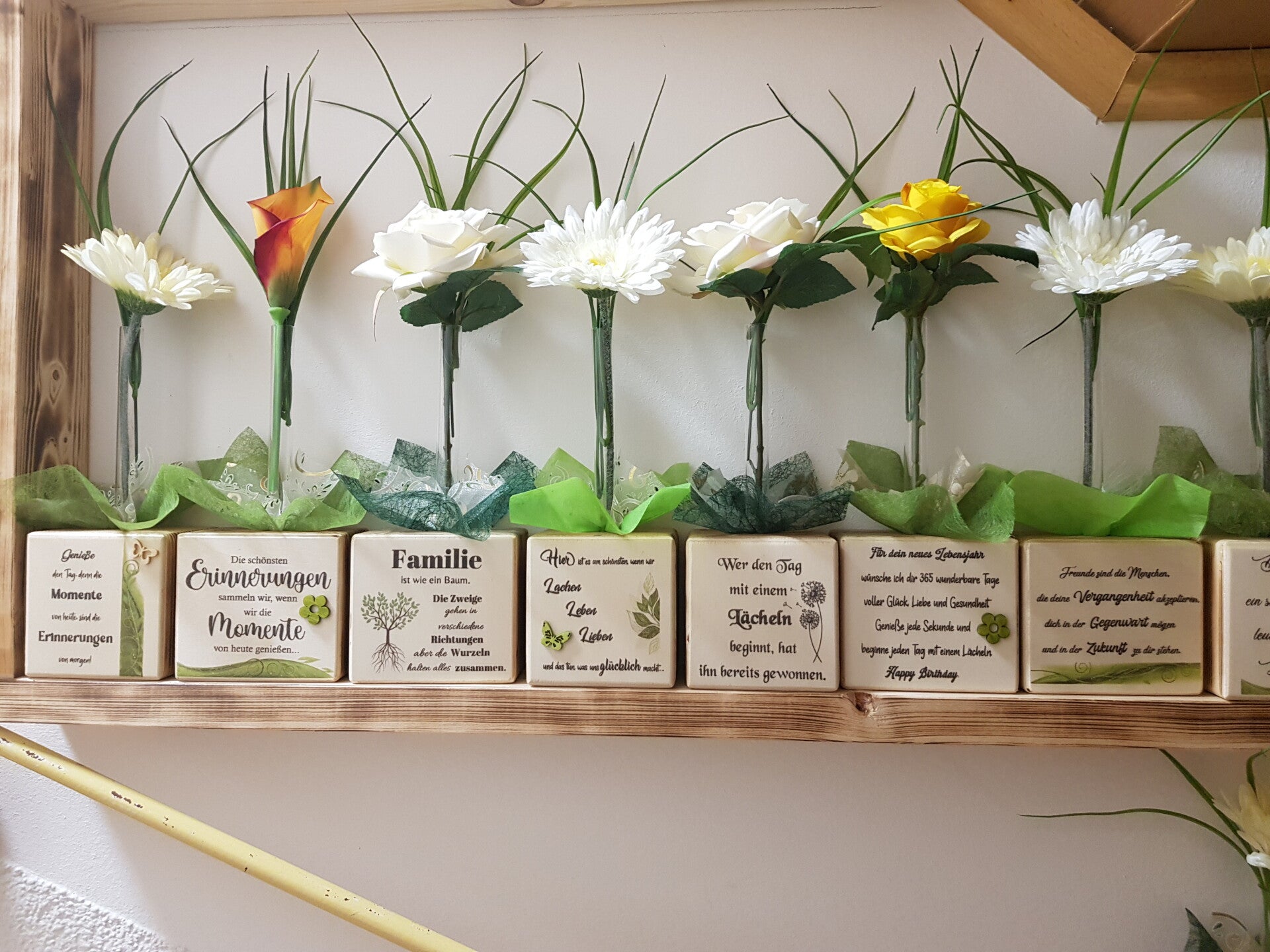 Dekowürfel mit Vase oder Weinglas und Gesteck, natürlich jeder Text auf Wunsch machbar!