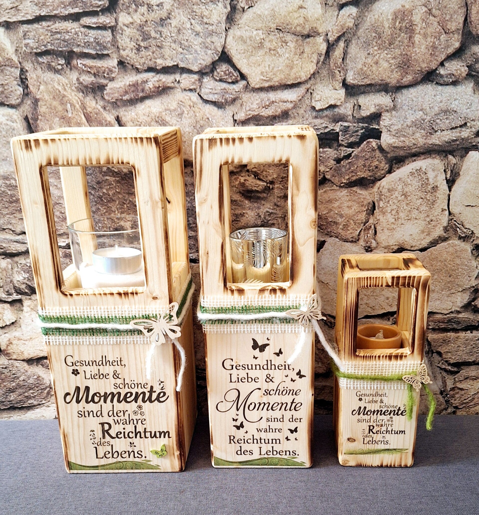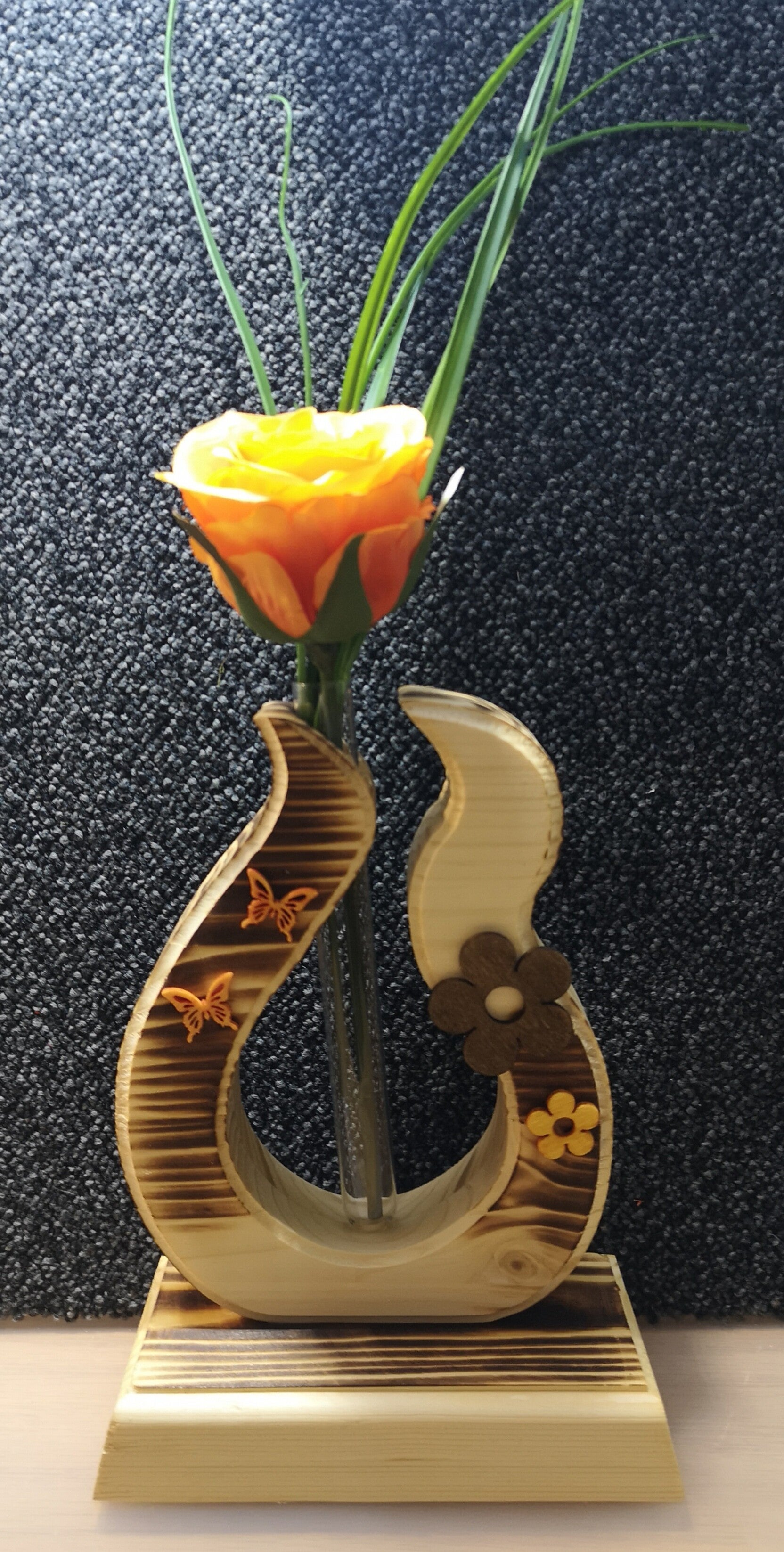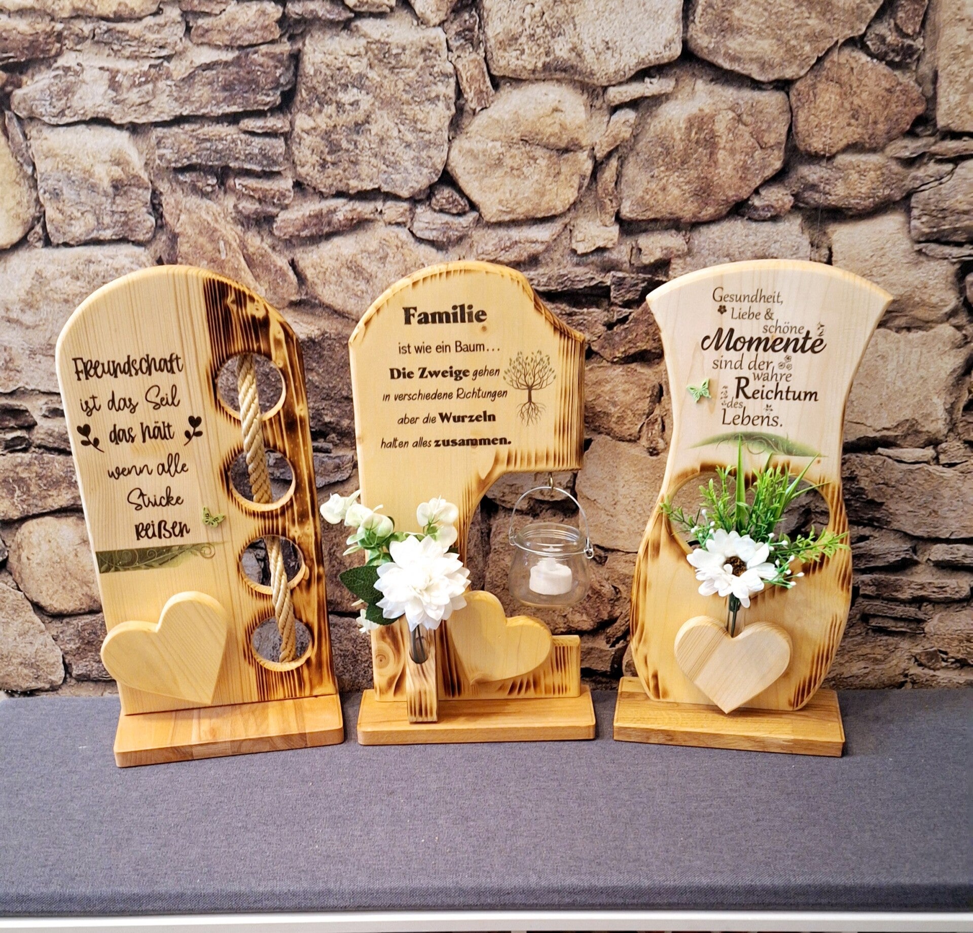 Dekorative Aufsteller aus Baumstämme oder Schichtverleimten Kantholz mit Kunstblumenschmuck und Dekoglas am Haubt.