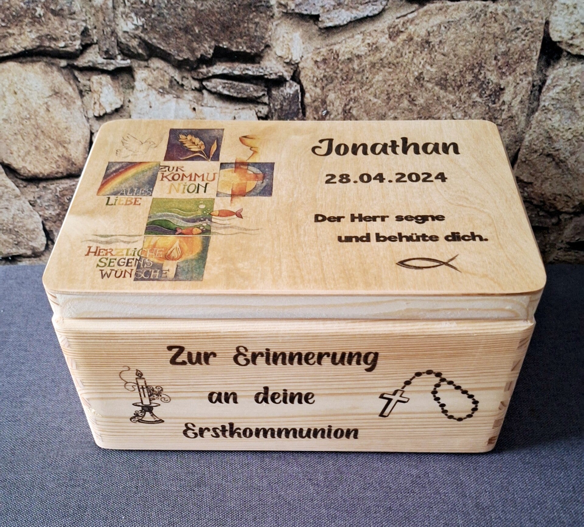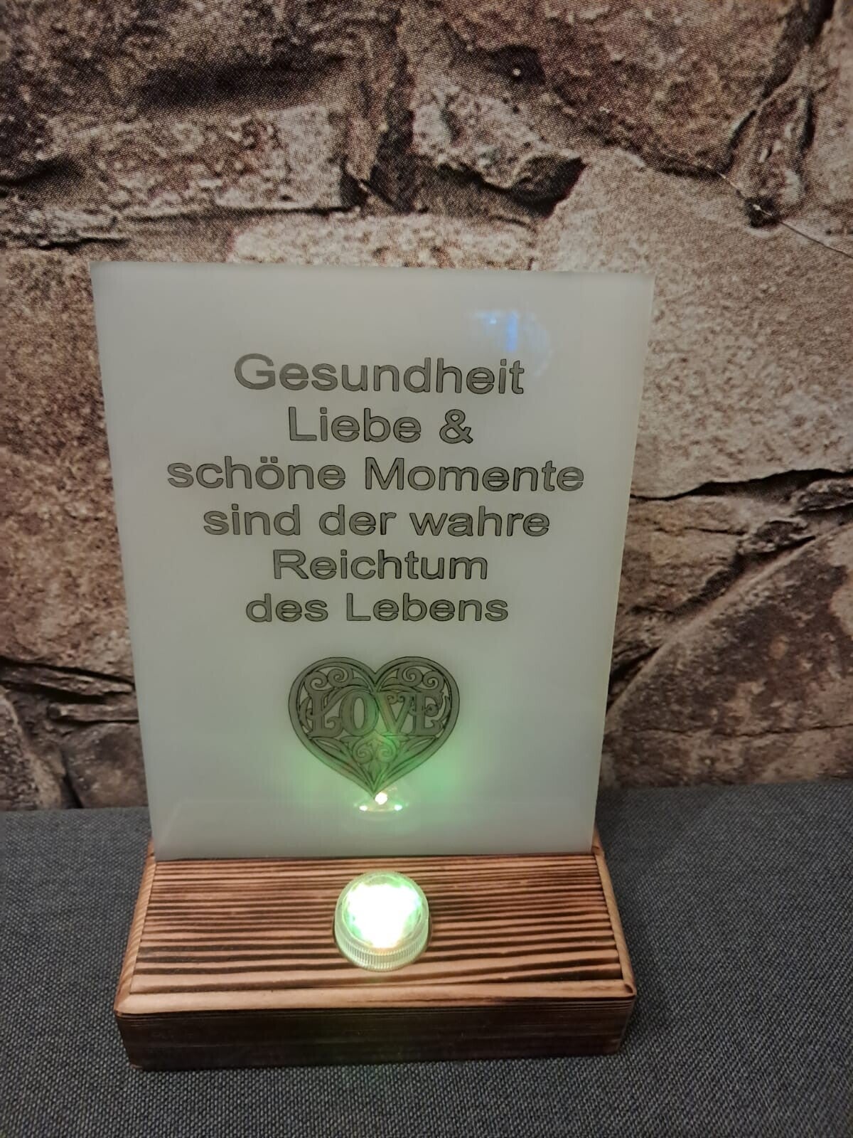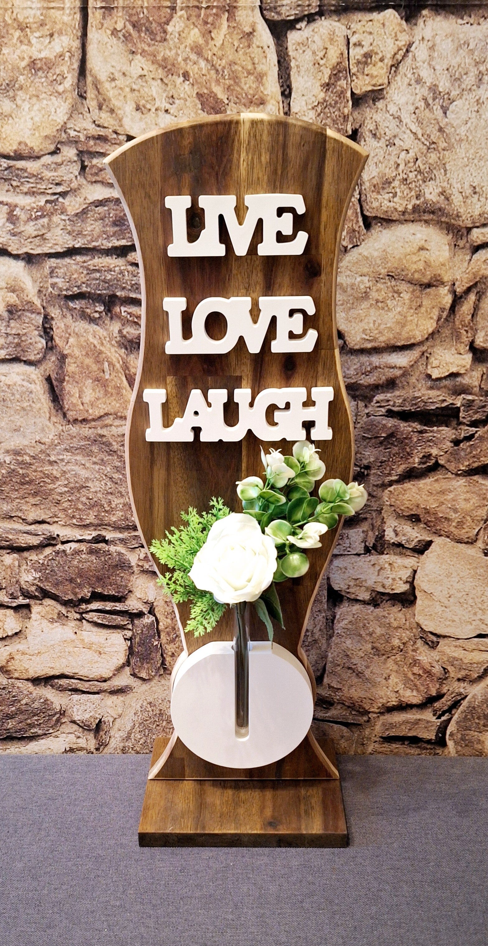 Dekorative Aufsteller aus Baumstämme oder Schichtverleimten Kantholz mit Kunstblumenschmuck und Dekoglas am Haubt.